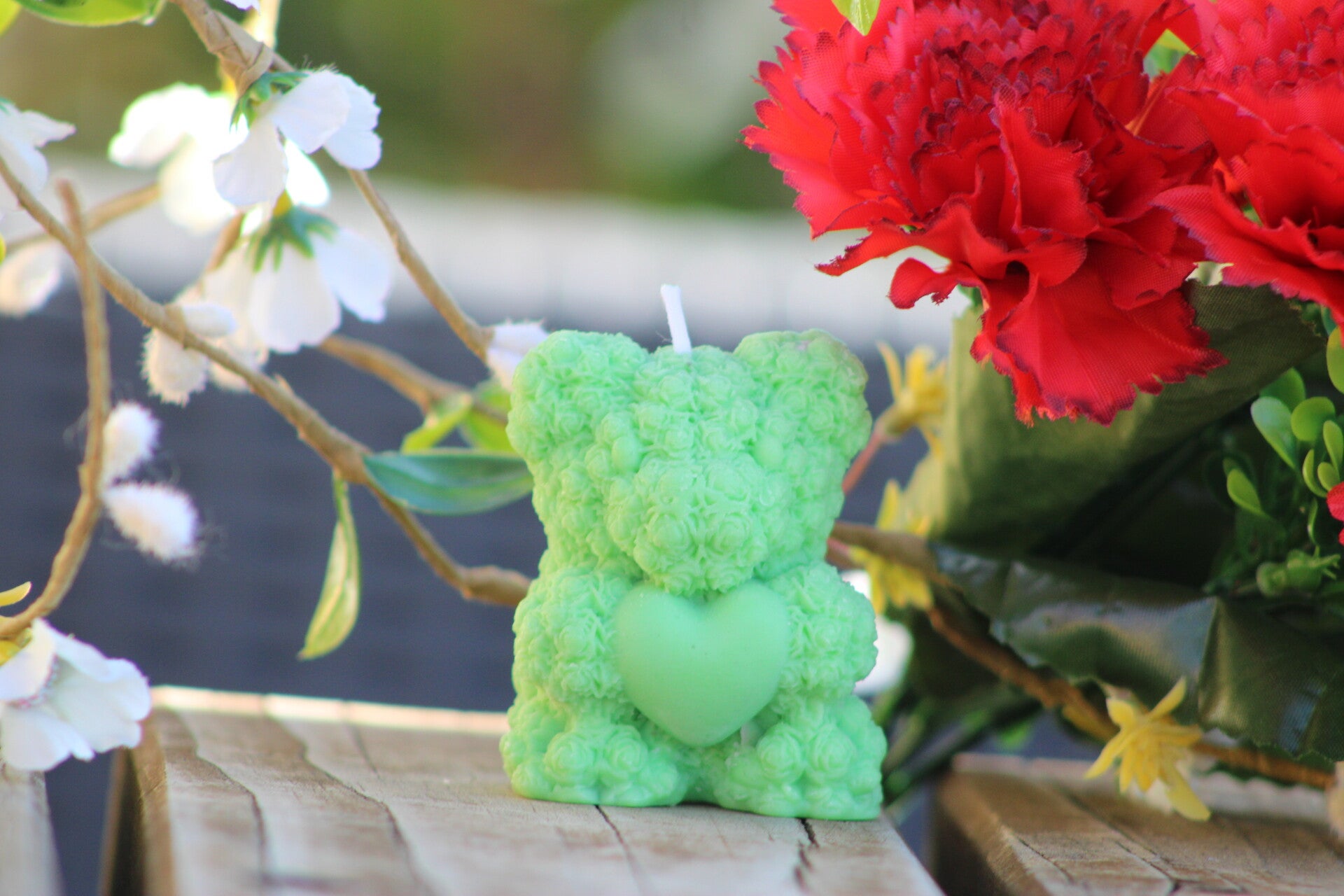 Apportez une touche de douceur et de romantisme à votre décoration avec cette magnifique bougie artisanale en forme d’ourson recouvert de petites fleurs et tenant un coeur. Son design délicat et plein de tendresse en fait un véritable objet décoratif, parfait pour sublimer une table, une étagère ou offrir en cadeau.